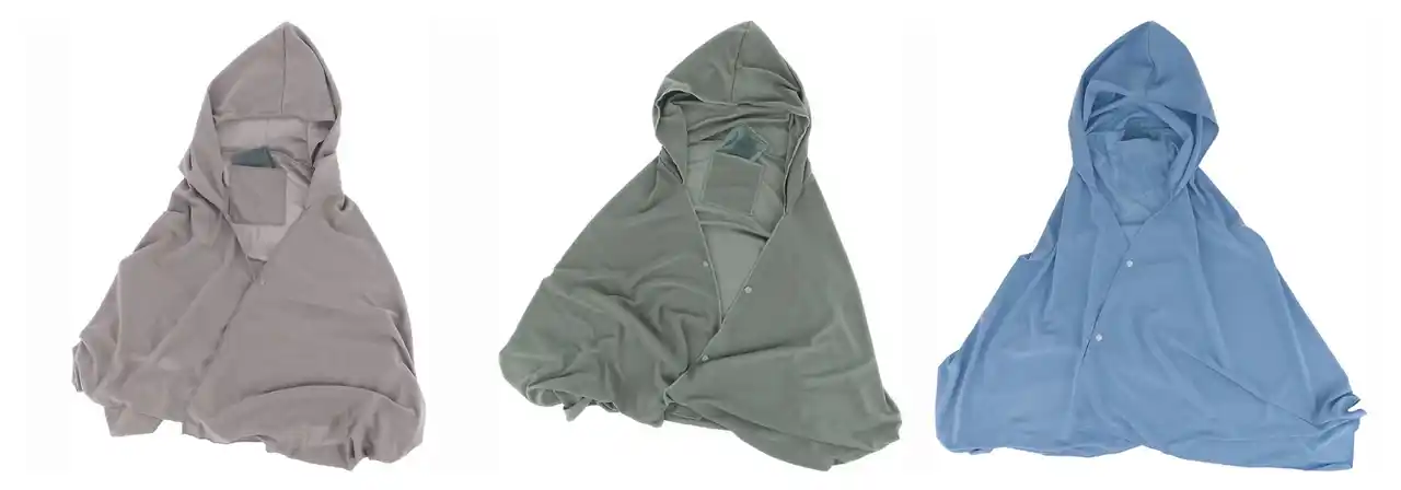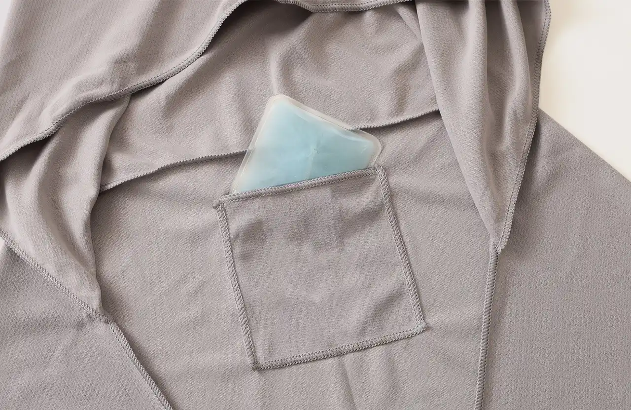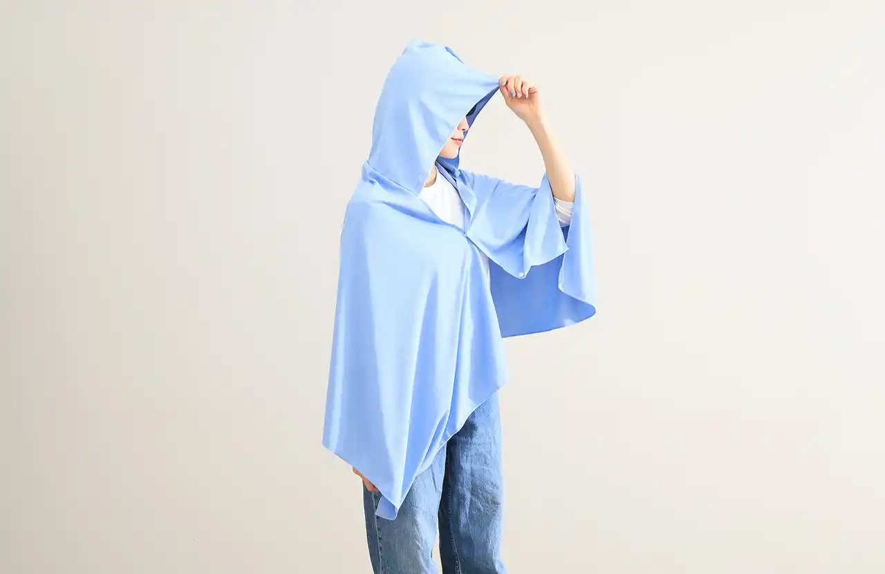 こちらもネック・ヘアバンドと同素材で、気化熱と冷感素材により心地よい冷たさを実現。UVプロテクション加工により、強い日差しから肌を守ります。150×60cmの大判サイズで肩から腕までしっかりカバーし、フード付きで頭部の紫外線対策にも対応。スナップボタンで簡単に着脱でき、アウトドアやスポーツ観戦にも適しています。さらに保冷剤ポケットを備え、より強力な冷却にも対応します。 |