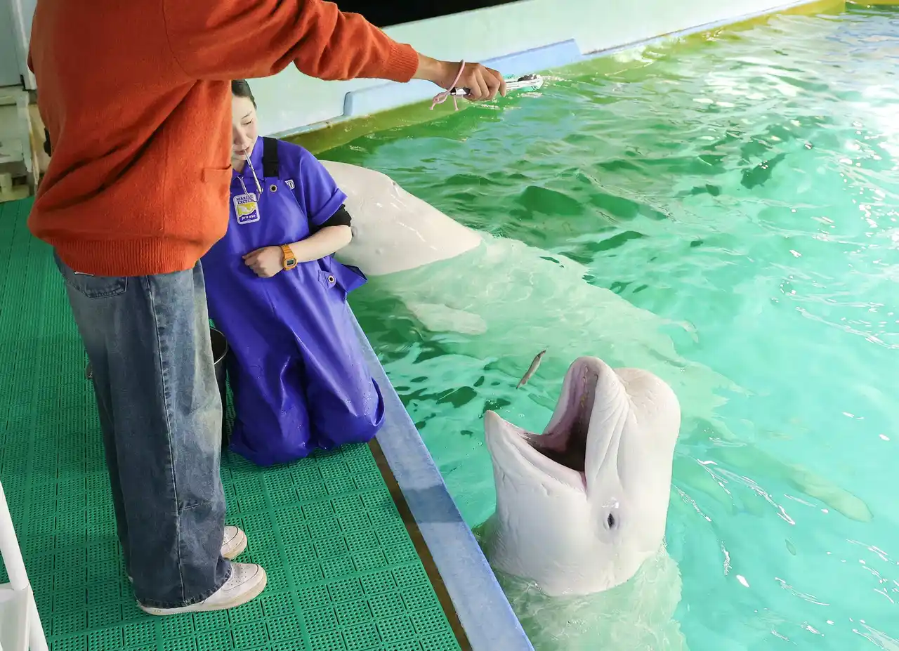 タッチだけでなくトングを使用したベルーガへの給餌も体験できます。 |