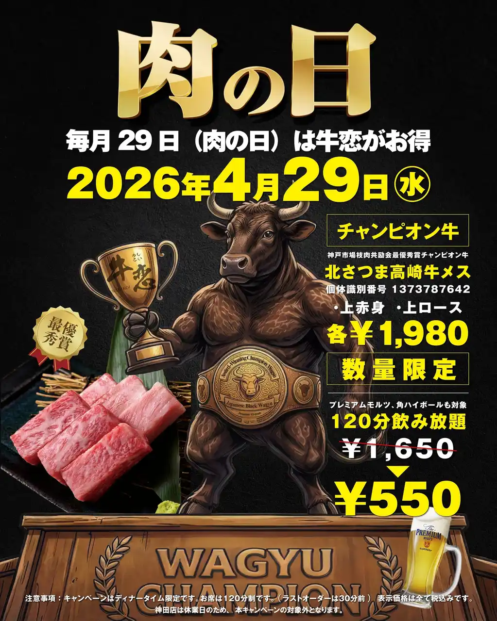 | 牛恋では毎月29日を「肉の日」とし、ディナータイム限定で通常120分飲み放題1,650円のところ550円で提供しております。 | ||||||||||