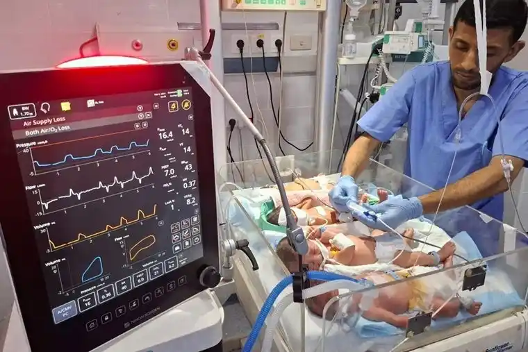 医療機材の不足が続くガザ地区の病院では、1台の保育器を複数の新生児で使っている=2025年7月16日 |