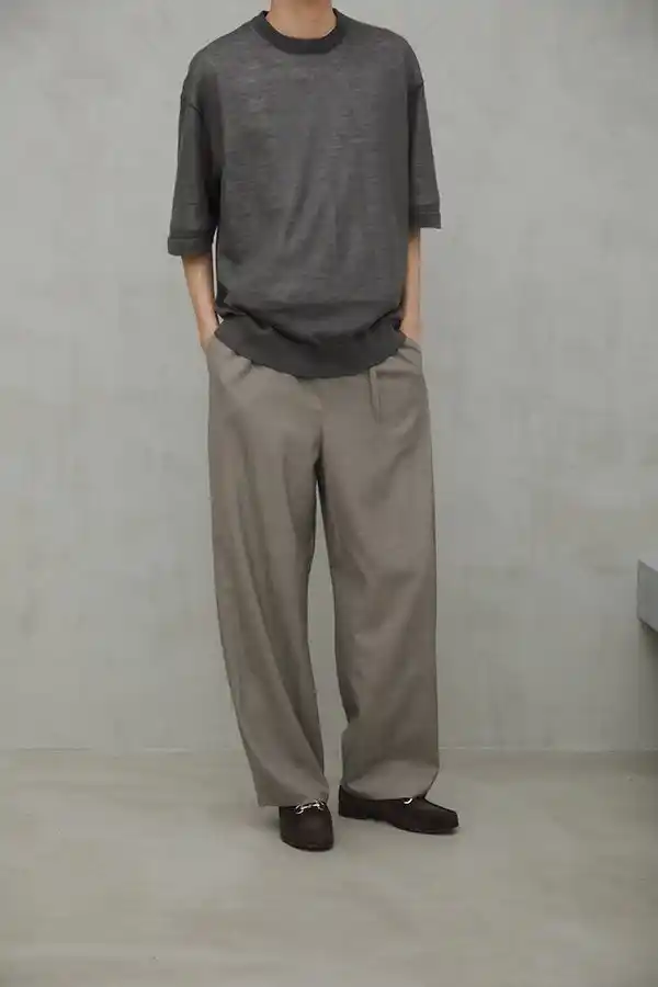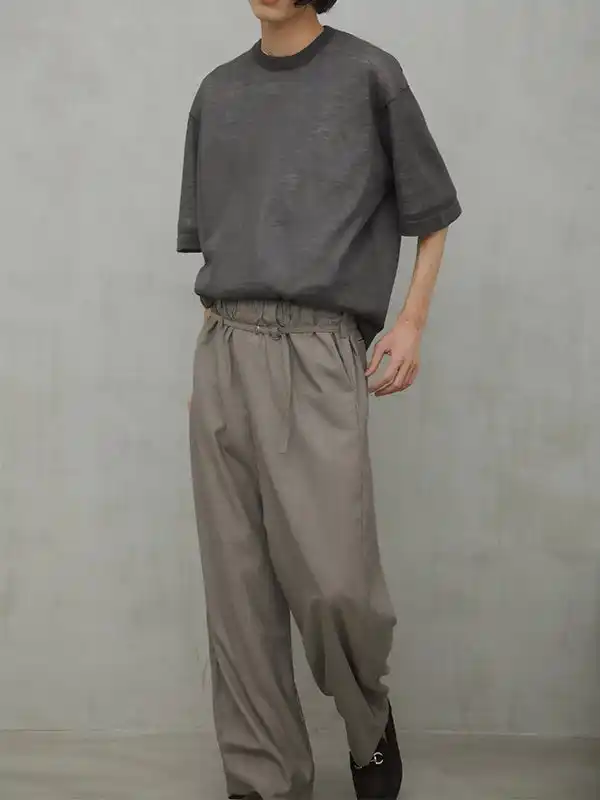 | トレンド傾向のカーブシルエットが特徴のメリノウールを使用したトロピカル素材のイージーパンツ。取り外しができる共布の細いベルト付きで、スタイリングによって使い分けて着用ができるのもポイントです。 | |||||||||||
