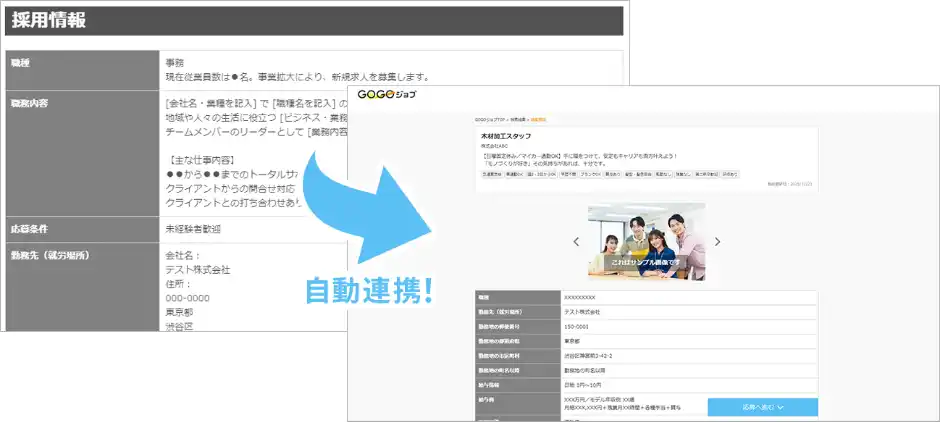 当社のホームページシステム利用者は、自社サイトに求人ページを作成するだけで「GOGOジョブ」へ自動掲載。求人媒体ごとにログインして求人票を掲載する手間を排除しました。別途の登録・申請は不要です。 |