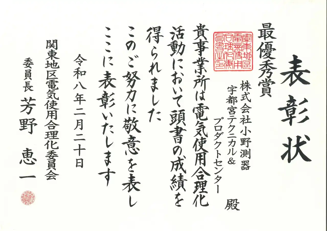 電子計測器の製造および販売を展開する株式会社小野測器(代表取締役社長 大越 祐史)は、2026年4月8日、「一般社団法人日本電気協会」の「関東地区電気使用合理化委員会」より当社の省エネへの取り組みが評価され「電気使用合理化表彰」で最優秀賞を受賞しました。 |