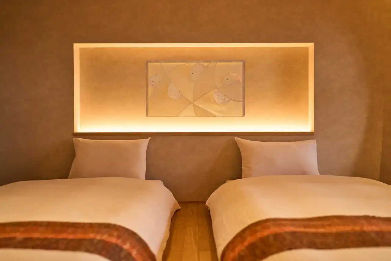 | ベッドボードには、県花でもあるりんごの花びらをモチーフとした、りんご和紙でできた壁掛けが空間を彩ります。ほんのりとピンク色を帯びた可憐な花を2種類のりんご和紙を用いて表現しました。剪定されたりんごの枝を粉砕して漉き込んだ和紙は、一つひとつ異なる表情の模様を生み出し、その独特な模様とやさしい風合いが重なり合うことで、手仕事ならではの温かみのある趣を醸し出します。 | |||||||||||||