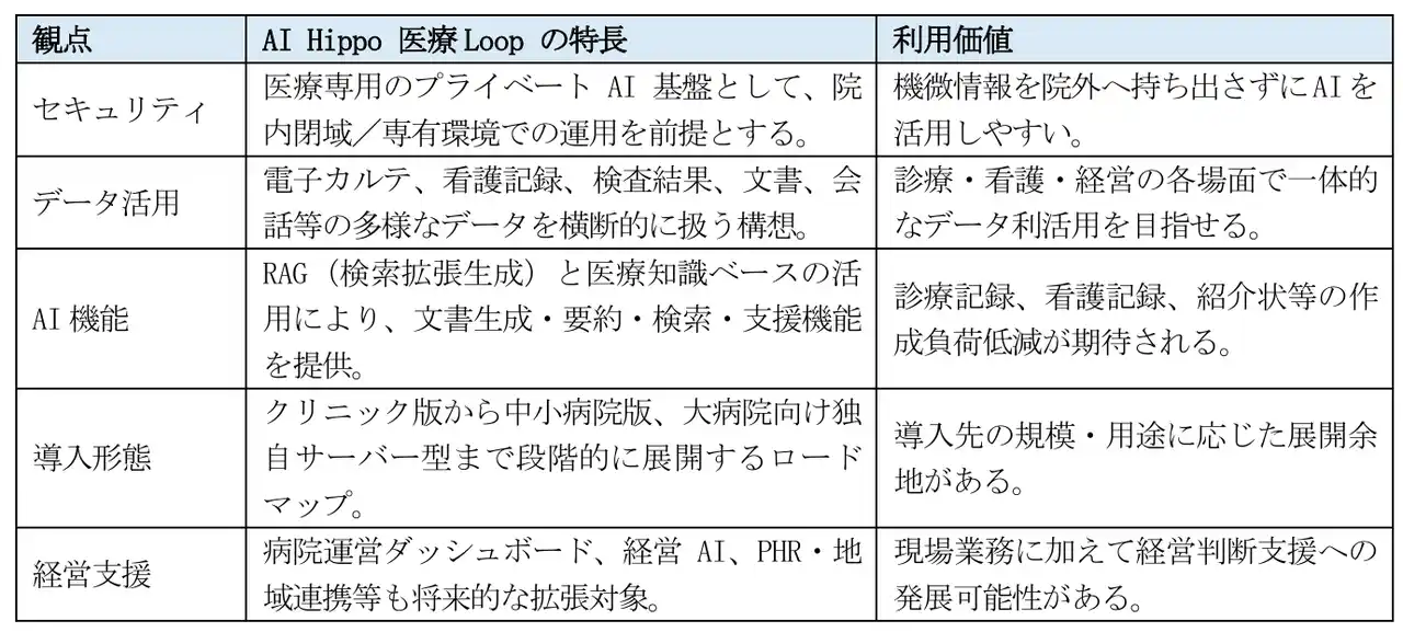 「AI Hippo 医療Loop」 は、医療機関内に閉じた環境での運用を志向する医療専用プライベートAI基 盤です。電子カルテ、看護記録、検査結果、各種文書等のデータを安全に活用しながら、診療支援、看 護DX、経営分析等に展開する構想が示されています。 |