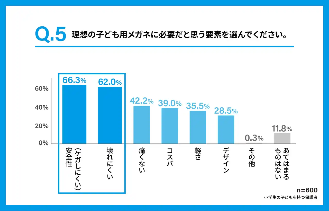 ・子どものメガネに求める要素、1位は66.3%で「安全性」、2位は62%で「壊れにくさ」。 |