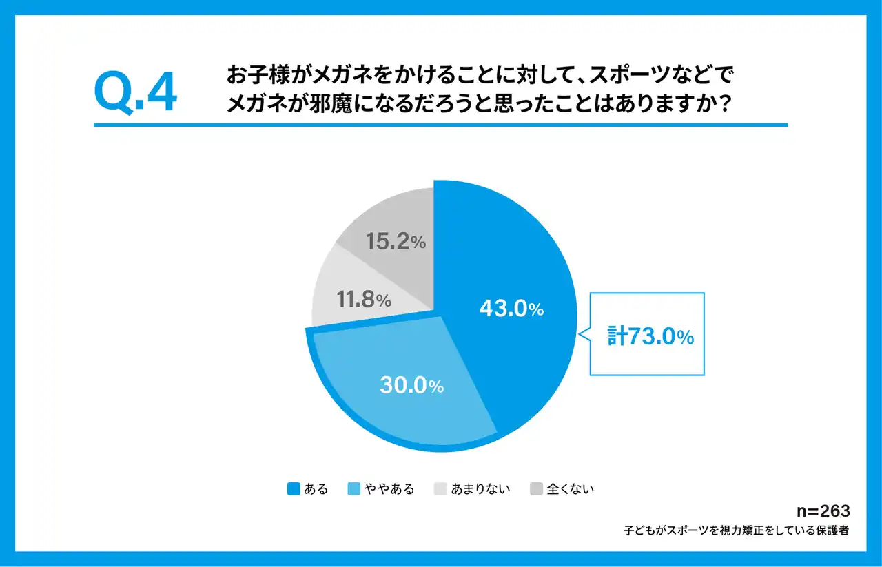 子どもがメガネをかけることに対して、スポーツなどでメガネが邪魔になるだろうと思ったことはありますか?という問いに対して、73%が「メガネが邪魔になるだろうと感じたことがある」と回答しました。運動時の使用において、メガネの扱いにくさを感じる保護者が多いことが明らかになりました。 |
