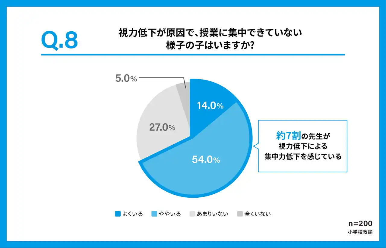 小学校教諭に子どもの視力と学習の関係について尋ねたところ、68%が「視力低下が原因で授業に集中できていない様子の子どもがいる」と回答しました。子どもの視力が学習環境にも影響している可能性が示されました。 |