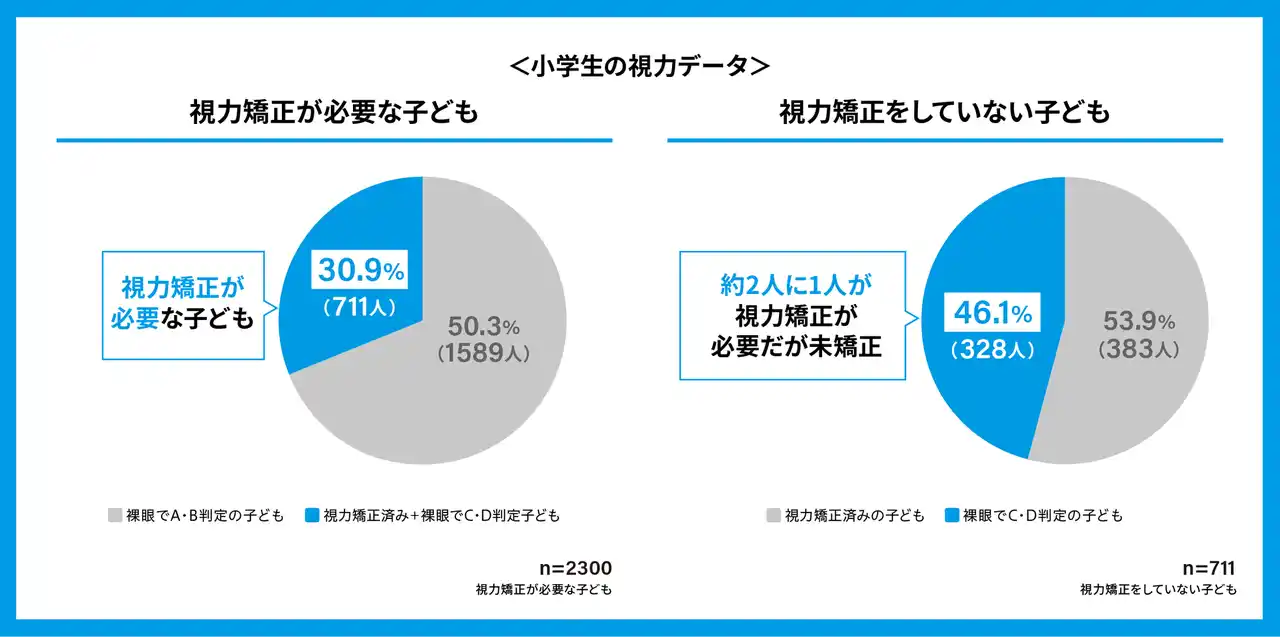 小学生2,300人のうち、383人はすでに視力矯正を行っている一方で、一般的に視力矯正が推奨されるC・D判定に該当しながらも、視力矯正を行っていない子どもが328人存在しており、合計711人の子どもが視力矯正を必要としていることが明らかとなりました。この結果は全体の約3割にあたり、小学生の視力低下進行の現状が明らかになりました。 |