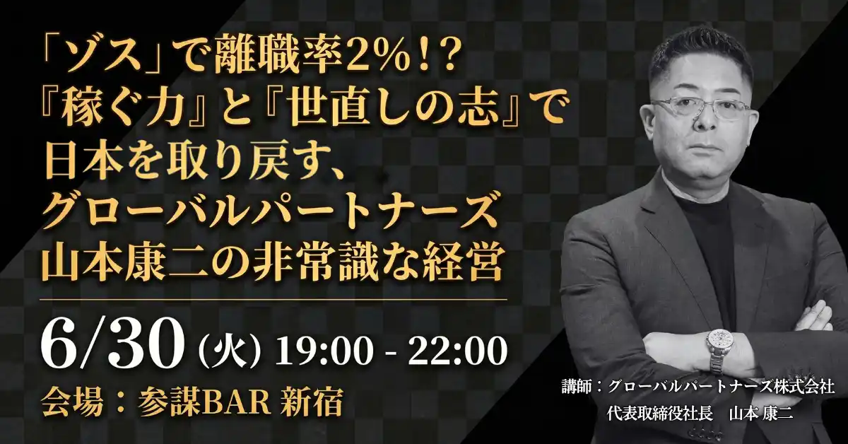 経営者コミュニティ「参謀」を運営する株式会社経営参謀(本社:東京都新宿区、代表取締役:新谷 健司)は、グローバルパートナーズ株式会社 代表取締役社長 山本康二氏を招き、離職率2%・採用コスト0円・社員平均年収約936万円を実現する「非常識な経営術」をテーマとした勉強会を2026年6月30日(火)に参謀BAR新宿にて開催します。「ホワイト化」によって力を失いつつある日本企業にカツを入れ、強い日本を取り戻すための考え方・取り組みを共有します。 |