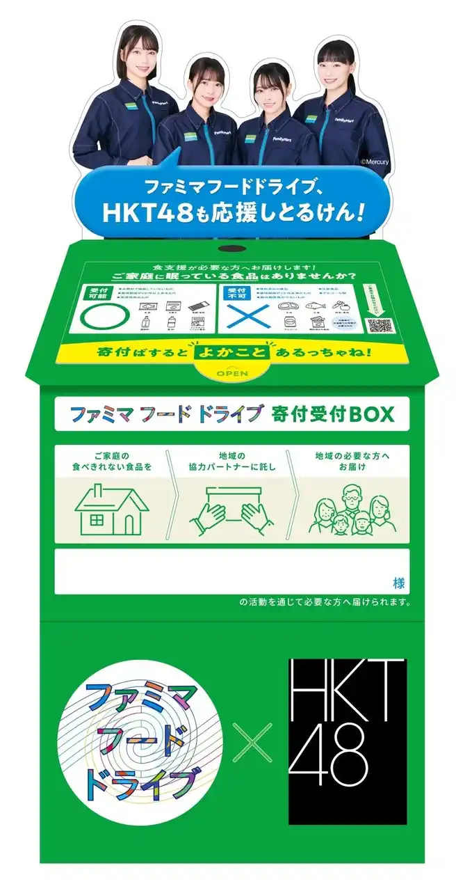 | このたび「いちばん地域に愛される」を目指した取り組みの一環として、2025年より継続している株式会社Mercury(マーキュリー)(本社:福岡県福岡市中央区、代表取締役:尾藤 洋介)が運営する「HKT48」との取り組みである、「ファミリーマート×HKT48 地域密着・九州応援プロジェクト」の新たな企画として、特別仕様の「ファミマフードドライブ」寄付受付BOXの展開を2026年4月22日(水)より順次展開いたします。 | |||