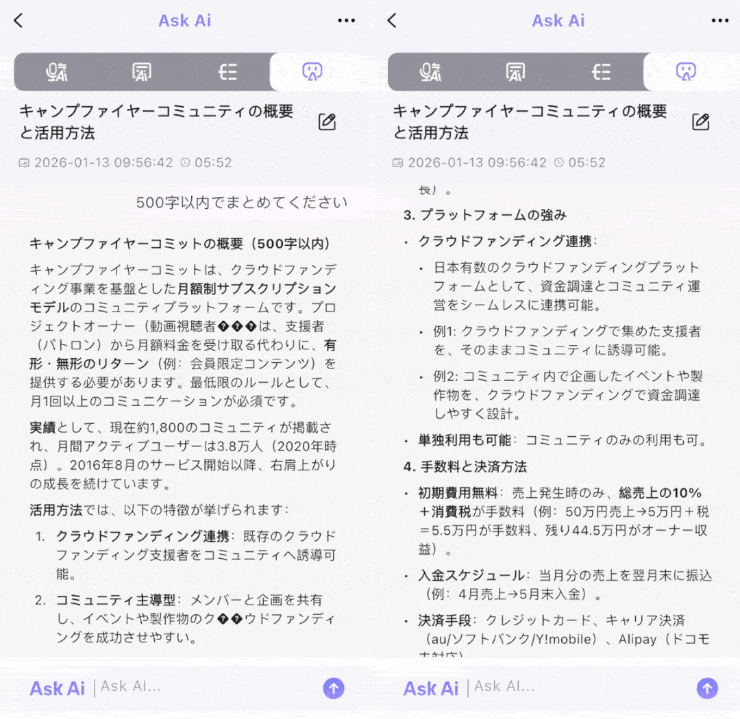 AIが作成した文字起こし文や要約も、あとから自由に編集。誤字修正、要点の追加、文体の統一まで、全てあなたの手で仕上げられます。 |