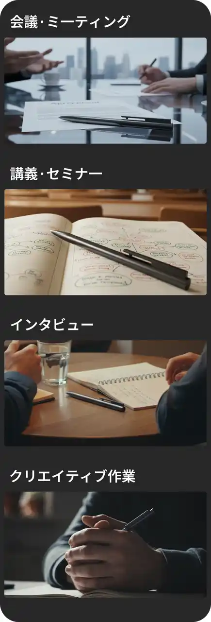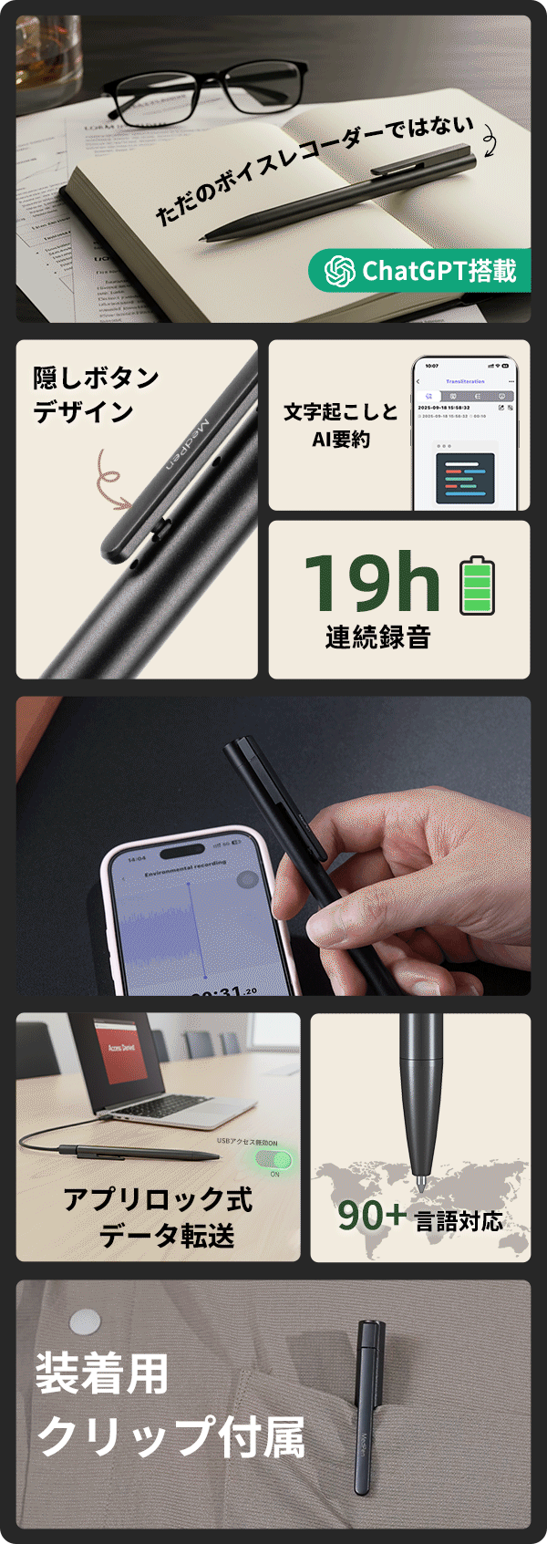操作ボタンはペンボディと完全に一体化しています。手にしたまま、自然な動きで録音を開始できるため、相手に気づかれることなく、大切な対話をそのままの形で記録します。 |