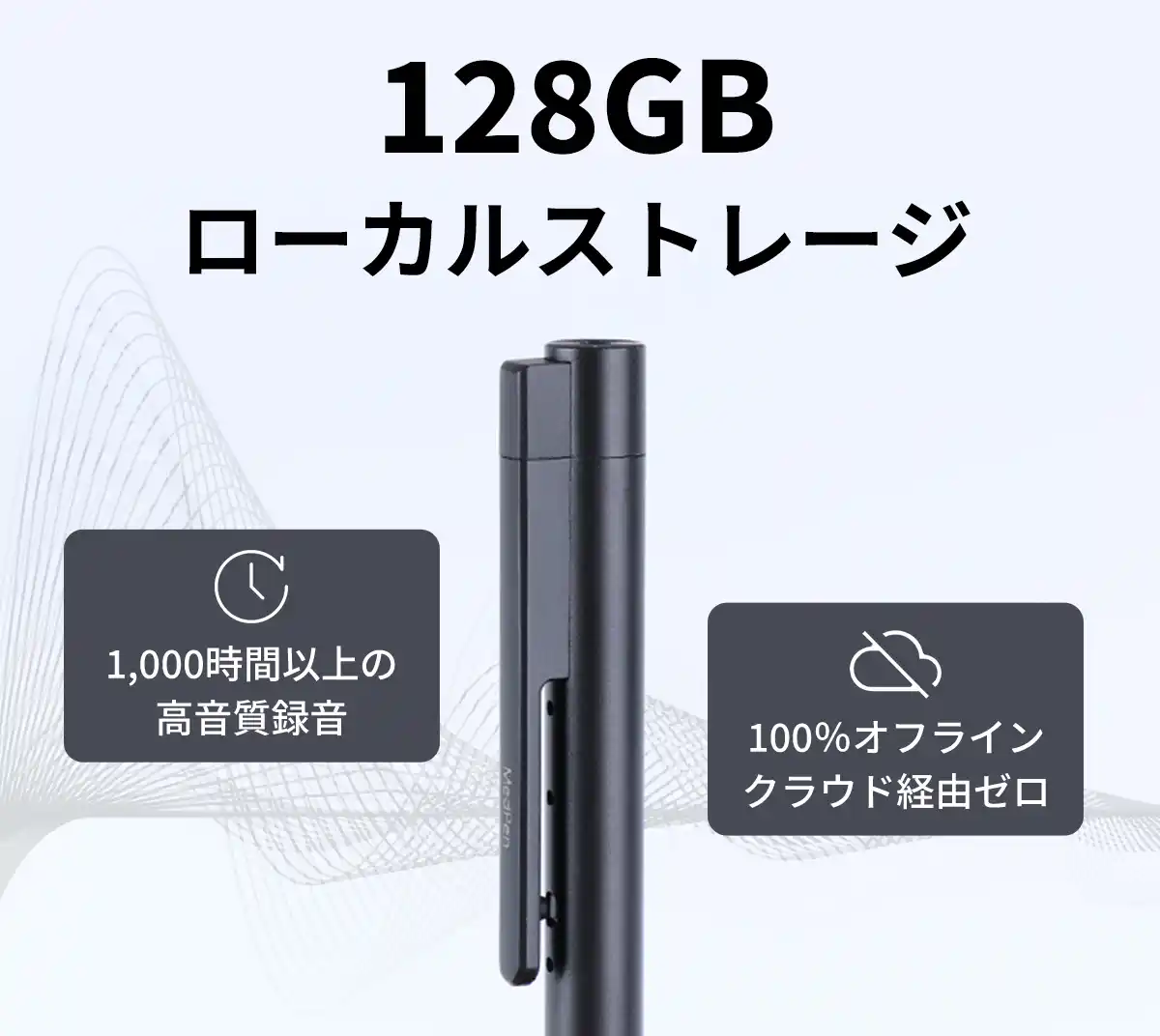 すべての録音データは、インターネットから完全に隔離された機内の128GB大容量ストレージに、暗号化されて直接保存されます。クラウドやネットワークを経由しないため、外部へのデータ流出の心配は一切ありません。安心して1,000時間以上の高音質な録音を保存可能。 |