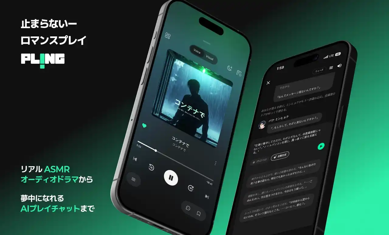 | 「プレイチャットは、AIキャラクターとの対話体験に当社のオーディオコンテンツ制作力を融合させた新しいインタラクティブコンテンツです。テキストチャットにとどまらず、会話の流れや感情の高まりに応じて音声やサウンドが有機的に組み合わさり、オーディオドラマのように体験が拡張される点が特徴です。今後もPLINGは、コンテンツとテクノロジーを融合した独自の没入型体験を継続的に進化させてまいります。」 | |||