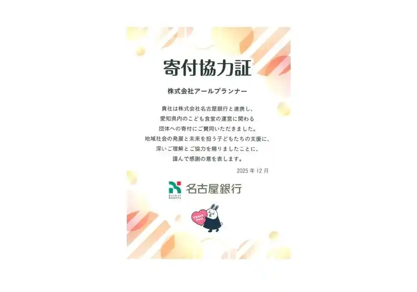 | 戸建住宅を中心とした住宅プラットフォーム事業を展開する株式会社アールプランナー(本社:名古屋市東区、代表取締役社長:梢 政樹、以下「当社」)は、株式会社名古屋銀行(本店:愛知県名古屋市、頭取 藤原 一朗、以下「名古屋銀行」)が取り扱う、地域の子どもたちを支援する「めいぎん地域みらいサポート定期預金」の趣旨に賛同し、2025年12月15日に5,000万円の預入れを実施したことをお知らせいたします。 | |||