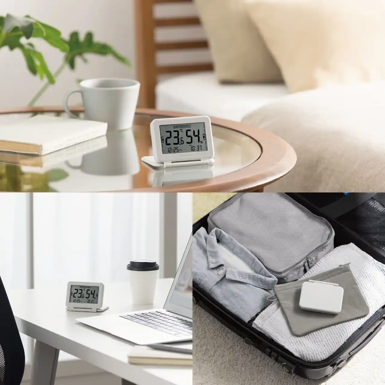 | 家の中のさまざまな場所や旅先のホテルなどで、温度・湿度を手軽に確認できます。 | ||||||||||||||