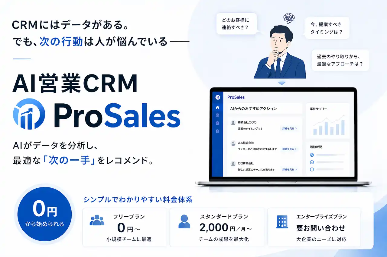 ProSalesは、営業活動データをAIが分析し、営業担当者やマネージャーに「次に取るべき行動」を提示する営業支援CRMです。顧客管理や案件管理にとどまらず、営業判断を支援するAI機能を特徴としており、営業DXを推進するツールとして企業の導入が進んでいます。 |