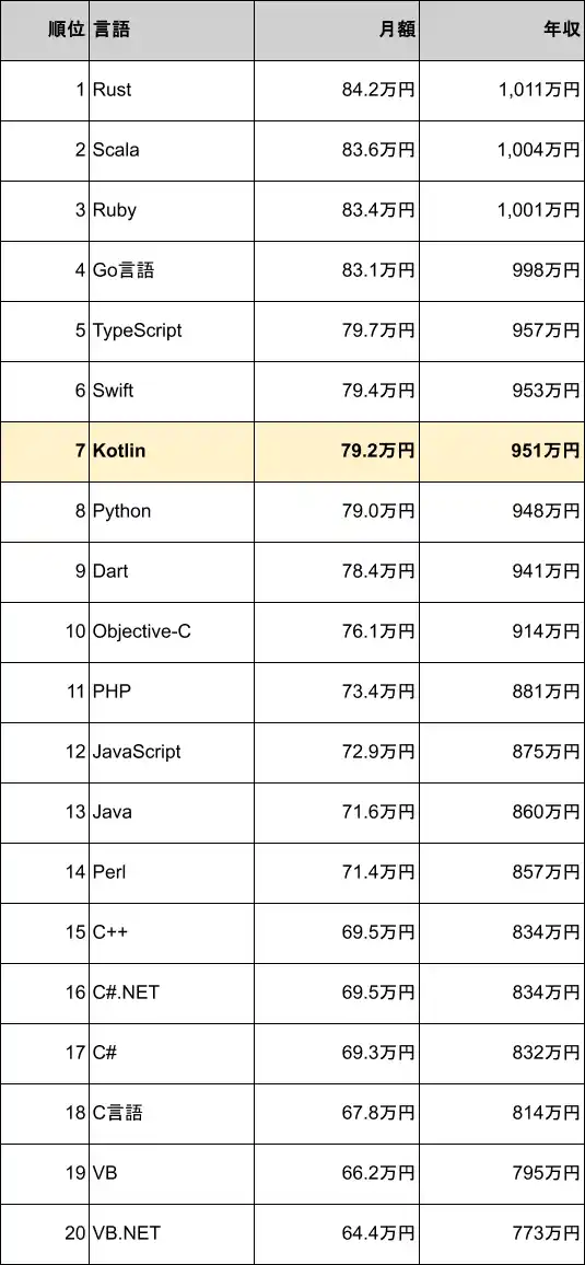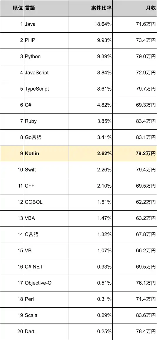 Kotlinの案件別平均年収ランキングは7位(951万円) |