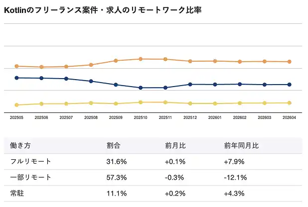 2026年4月時点のKotlin向けフリーランス案件・求人におけるリモートワーク比率は、フルリモートが31.6%、一部リモートが57.3%、常駐が11.1%となっています。 |