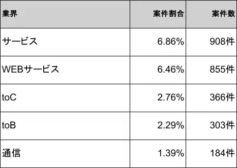 2026年4月時点のKotlin案件は、サービスが6.86%(908件)で1位、WEBサービスが6.46%(855件)で2位、toCが2.76%(366件)で3位、toBが2.29%(303件)で4位、通信が1.39%(184件)で5位となり、上位5業界で全体の約19.76%を占めます。 |