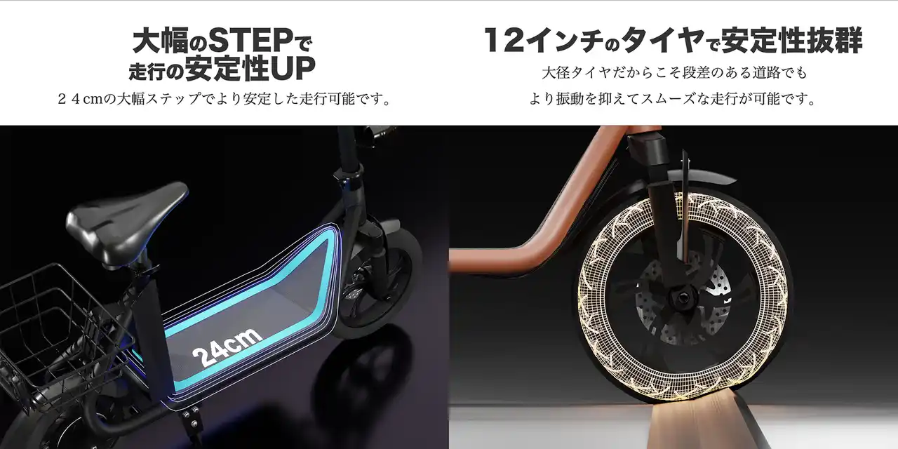 バイクや自転車で日常の移動における不安要素の一つである「ふらつき」を軽減し、より安心して利用できる設計となっております。 |