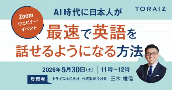 「英語を話せるようになりたいけど、何から始めればいいのか分からない」「生成AIは知っているが、具体的な英語学習への使い方が見えていない」など、今年こそ英語を話せるようになりたい、そしてこれまでの学習に限界を感じている方のための特別ウェビナーを開催します。本セミナーでは、単なる知識の習得ではなく、「AIと人が融合することで、日本人が最短最速で英語を話せるようになる仕組み」を徹底解説します。元ソフトバンク社長室長として数々のプロジェクトを成功させてきた三木雄信が、自らの経験に基づいた「英語学習の常識を変えるメソッド」を直接お伝えします。