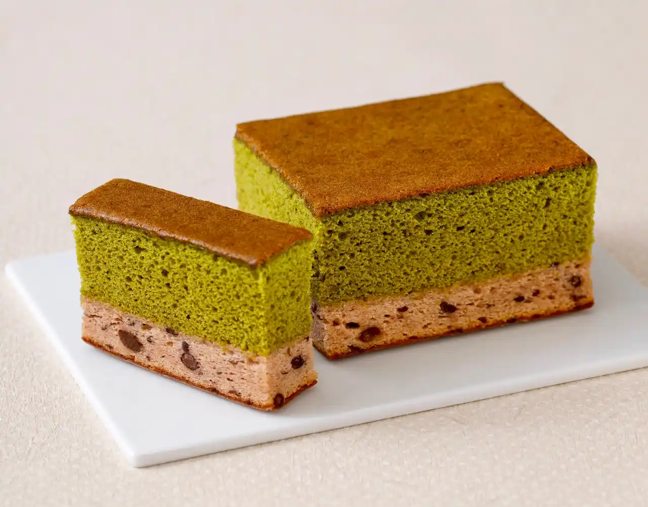 京都宇治の抹茶を使用したカステラ生地と、北海道大納言小豆を練り込んだ、つぶ餡ベースのカステラ生地を二層に重ねた、三源庵の人気商品。 |