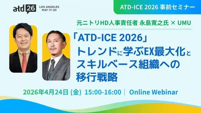パフォーマンス向上を支援するAI学習プラットフォーム「UMU(ユーム)」を展開するユームテクノロジージャパン株式会社(本社:東京都新宿区、代表取締役:松田 しゅう平 、以下 ユームテクノロジージャパン)は、トイトイ合同会社(代表:永島 寛之)と共同で、「『ATD-ICE 2026』トレンドに学ぶ、EX最大化とスキルベース組織への移行戦略」と題するオンラインセミナーを、2026年4月24日(金)15:00より開催いたします。 |