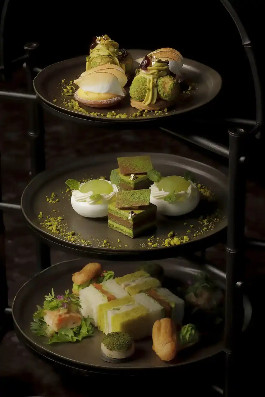 スタンド上段には、香り高いイタリア産ピスタチオを主役にした「サントノーレ」と、ライムの瑞々しさを閉じ込めたタルトをご用意いたしました。サントノーレ、には「緑の宝石」と称されるピスタチオのクリームに、ほんのりと甘酸っぱいアマレーナチェリーのジャムをアクセントにしました。ライムのタルトは、アーモンドクリームのやわらかなコクと、軽やかなメレンゲを合わせた特製ライムクリームを丁寧に焼き上げ、トップに散らしたライムピールが爽やかさを際立てます。 |