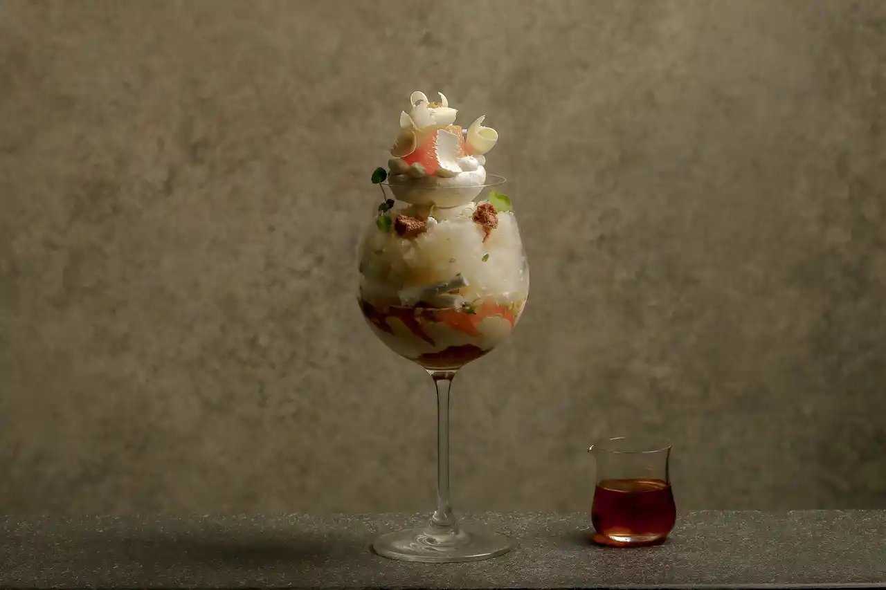 はじめに、フレッシュマスクメロンとジャージーミルクのジェラート、カモミールのジュレを合わせたミニパルフェのアミューズを。カモミールのやさしい甘さと鹿児島県産新茶のすがすがしい青さに、はちみつの丸い甘みが重なり、清らかな余韻が広がります。 |