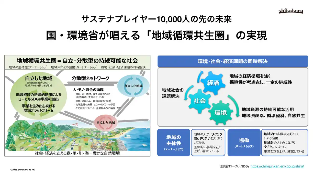shikakeruの掲げる「2030年サストレビジョン」とは、全国に展開する「サストレ」を通じて、「年間1万人のサステナプレイヤー」を育成し、子どもたちと大人が共に地域と未来を本気で考える当事者へと変わることで、「地域循環共生圏の実現を目指す」中長期的な目標です。 |