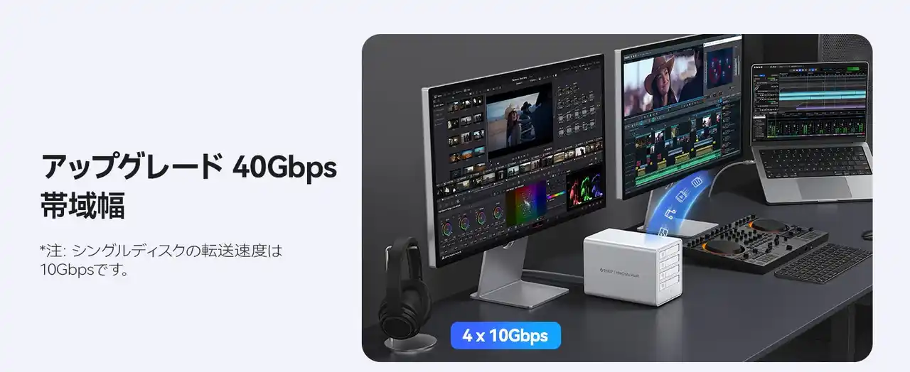 40Gbpsの圧倒的帯域: 最新のチップセットを搭載し、理論値最大40Gbpsの超高速転送に対応。4K/8KのRAWデータも瞬時に移動可能です。 |