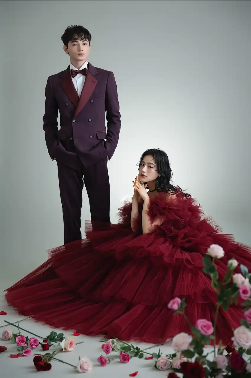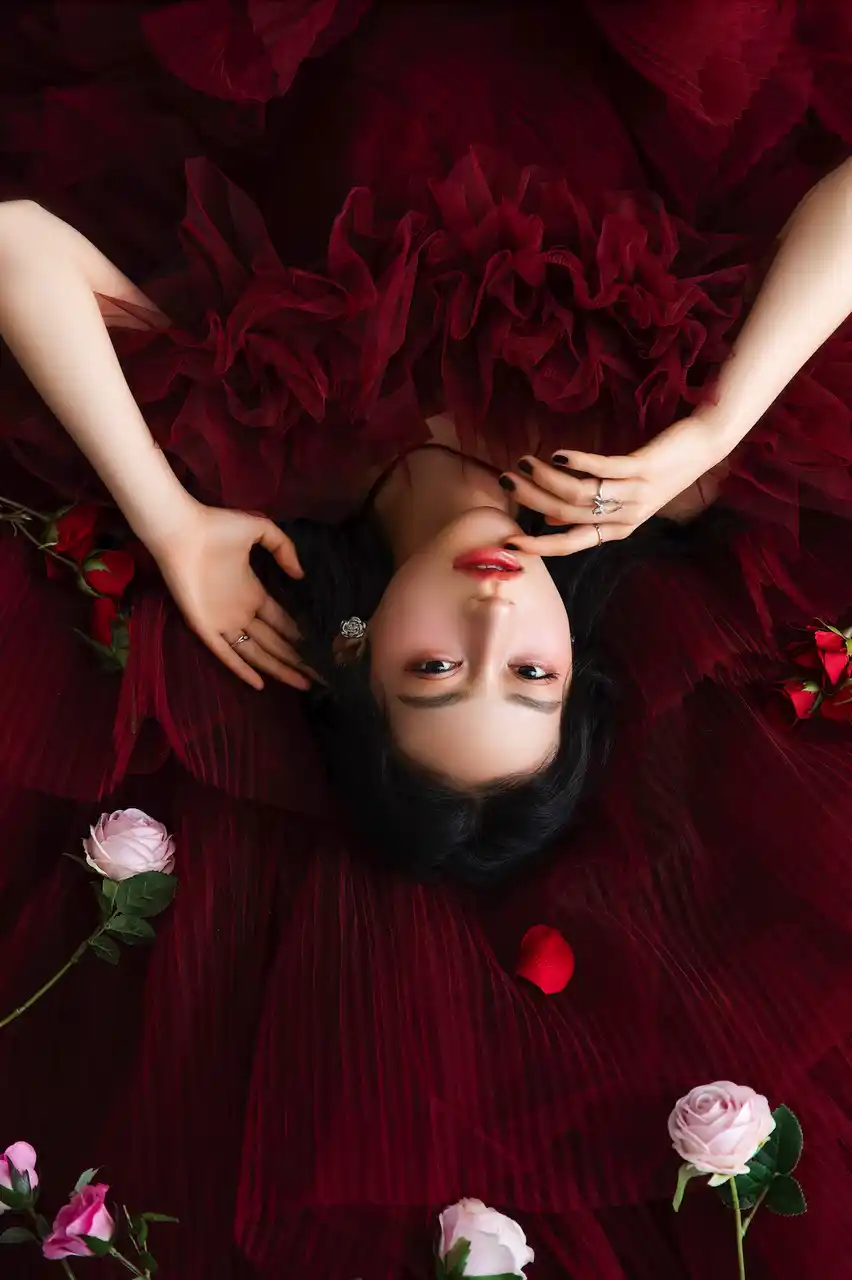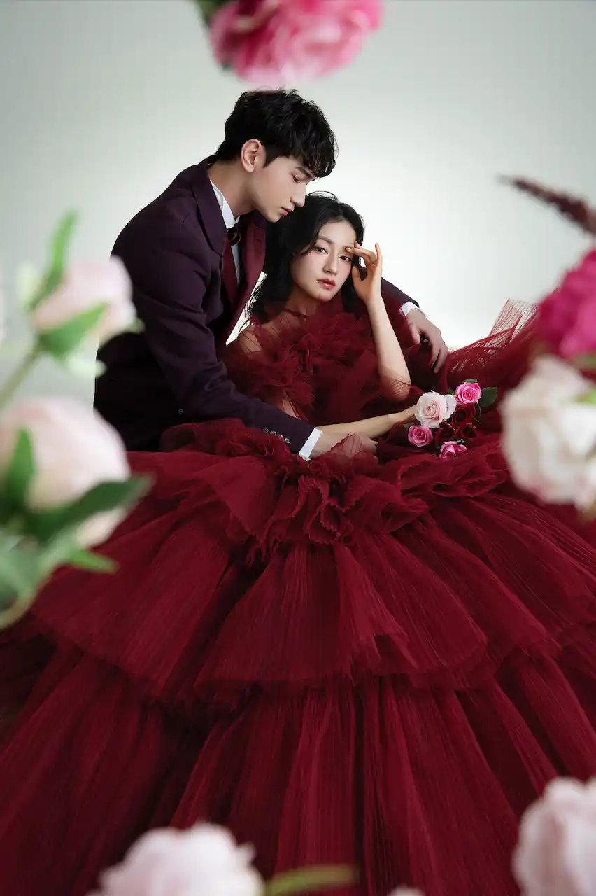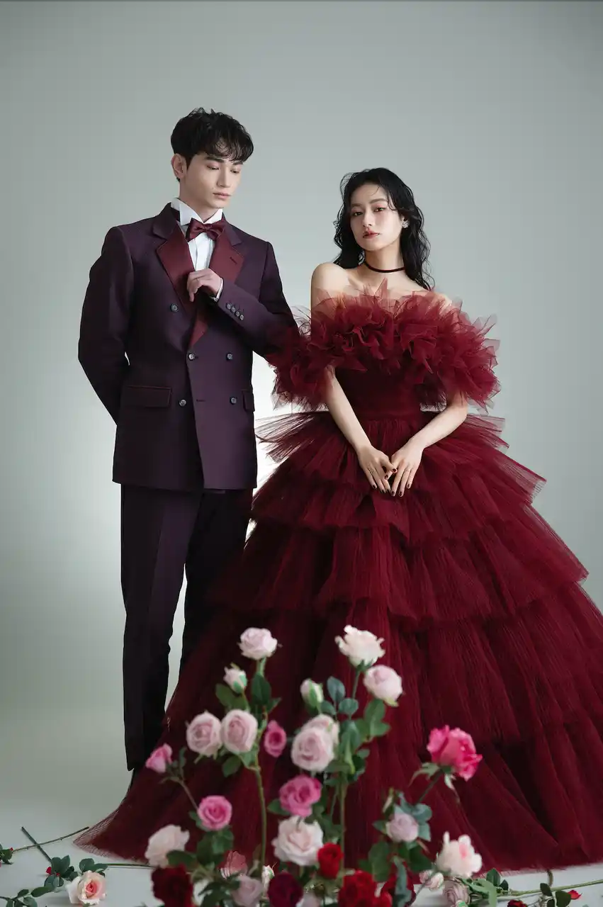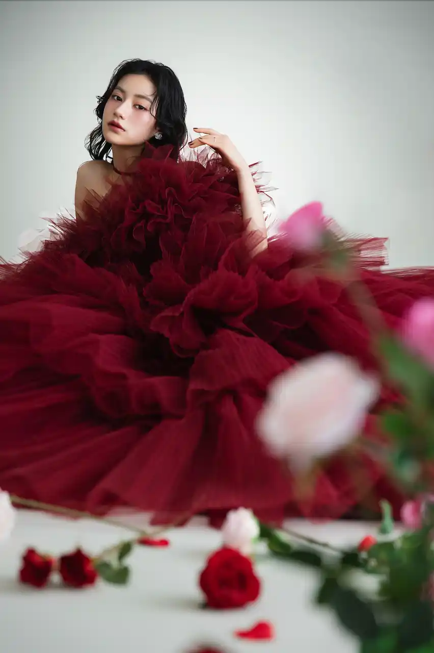 幾重にも重なるボルドーのチュールが動くたびに表情を変え、唯一無二の存在感を放ちます。 |