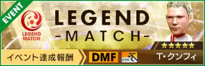 “レジェンドマッチ”は、レジェンドチームと対戦し、勝利ポイントゲージが一定量に達すると豪華なアイテムが獲得できるイベントです。今回の“レジェンドマッチ”では、10,000pt達成報酬の★5選手が入れ替わり、新★5選手「T・クンフィ」が登場します。 |