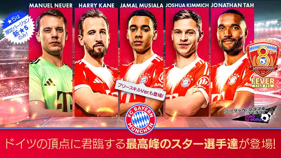 好評配信中のスポーツ育成シミュレーションゲーム『プロサッカークラブをつくろう! ロード・トゥ・ワールド』(以下『サカつくRTW』)では、FCバイエルン・ミュンヘンのスーパースターが新★5選手として登場する“8th Anniversary FEVER STAR FES”を、2026年4月22日(水)より開催します。 |