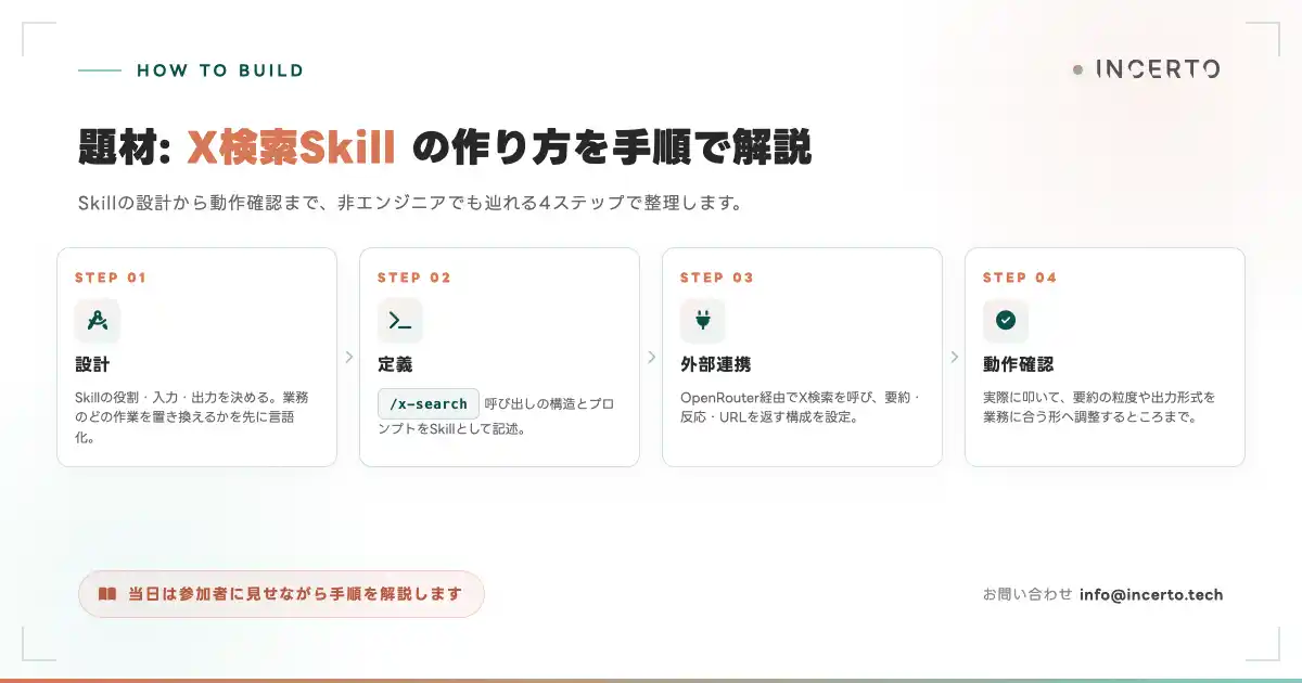 第2回では、Skillsの概念・公式Skillsの活用方法・ビジネス応用事例に加え、OpenRouterの役割と、X検索Skillの作り方の解説までを扱います。技術詳細よりも、業務のどこに当てはまるかを重視した構成にします。 |