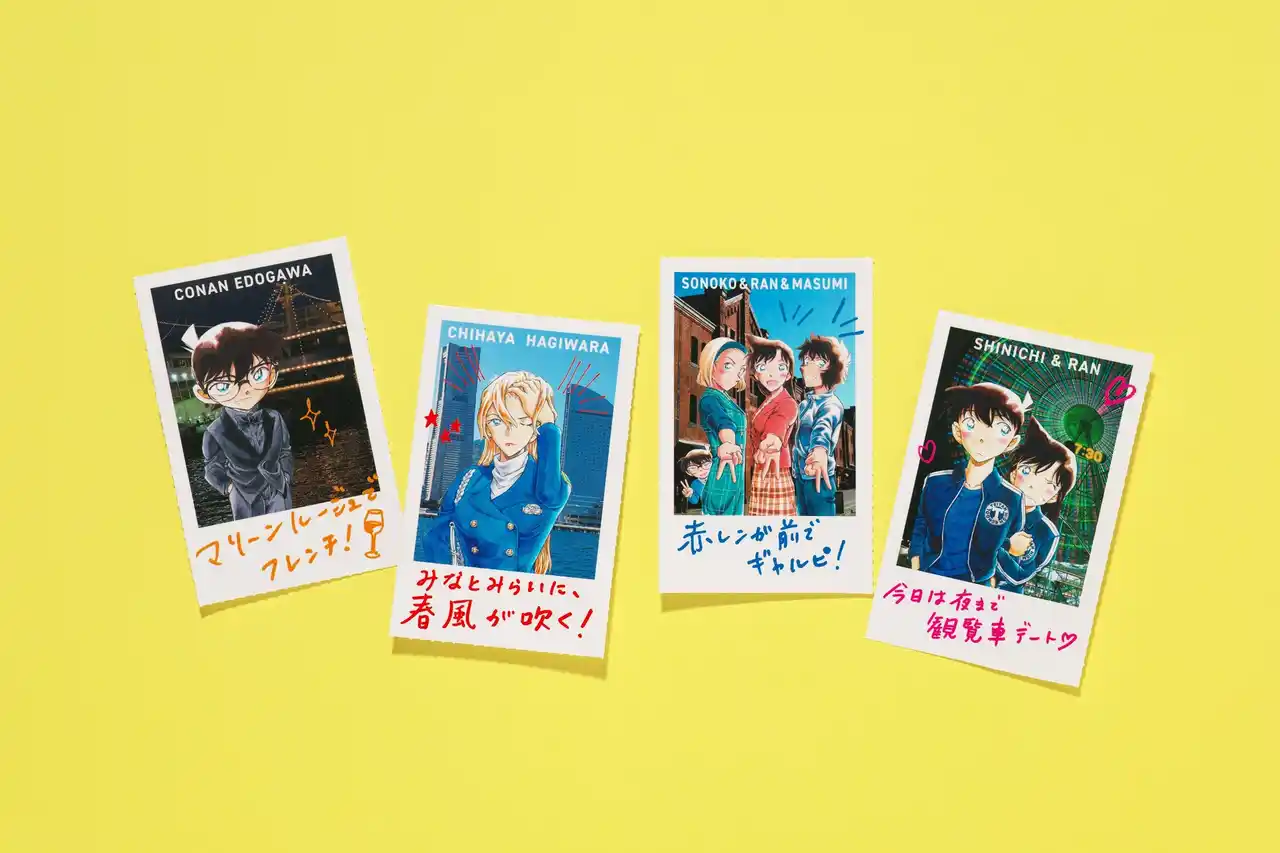 | 江戸川コナン×マリーンルージュ、萩原千速×みなとみらい、鈴木園子&毛利蘭&世良真純×赤レンガ、工藤新一&毛利蘭×コスモクロック21と、人気キャラと劇場版の舞台である横浜の名スポット写真を合わせたチェキサイズのシールです。まるでキャラが観光地で記念撮影しているような、特別デザインとなっています。 | |||||||||||||||