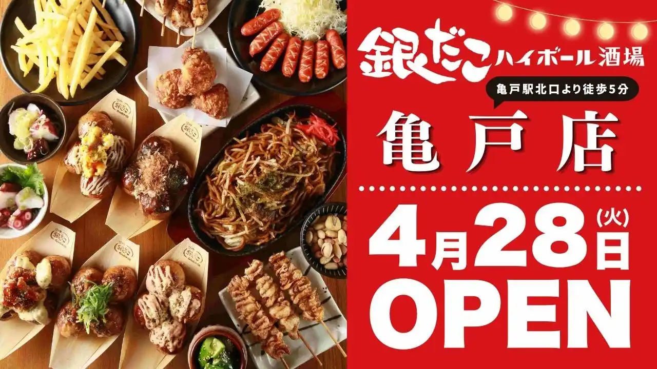 築地銀だこ を展開する 株式会社ホットランドホールディングス (本社:東京都中央区、代表取締役社長:佐瀬守男)の連結子会社で、「銀だこハイボール酒場」や「おでん屋たけし」などの酒場事業を展開する 株式会社オールウェイズ (本社:東京都中央区、代表取締役社長:内田善行)は、2026年4月28日(火)東京都江東区に『銀だこハイボール酒場 亀戸店』 をオープンいたします。 |