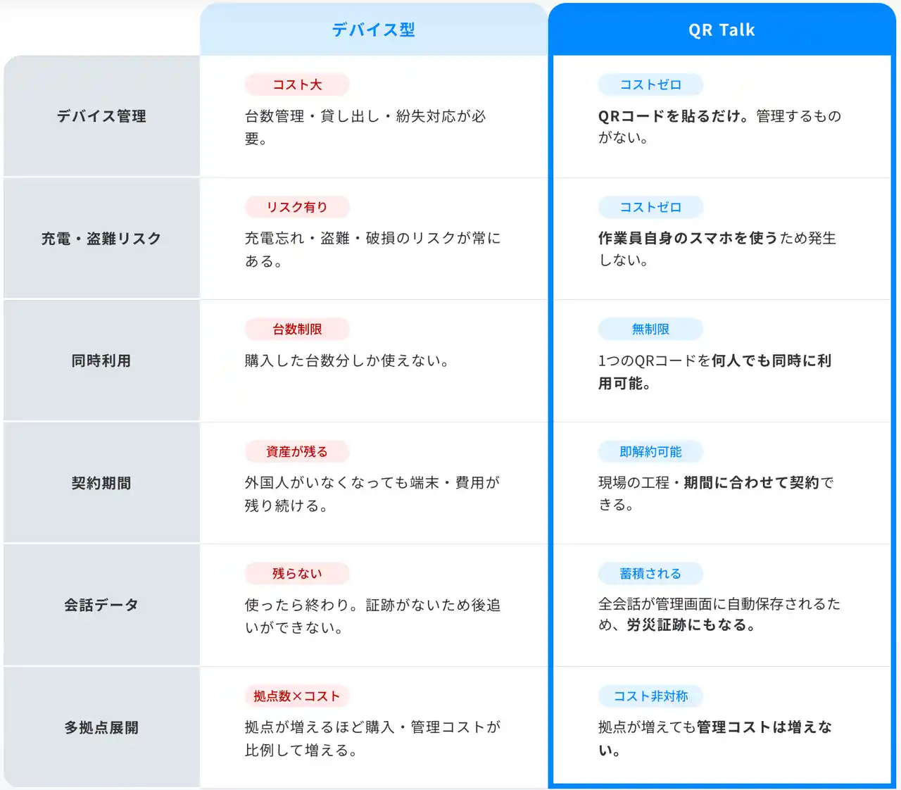 QR Talkは単なる翻訳ツールではなく、建設現場における以下の経営課題に対するインフラと位置付けられます。 |
