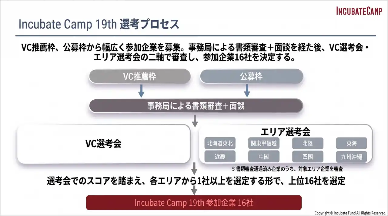 ※「エリア選考会」はIncubate Camp 19th運営メンバーを含む各エリアのパートナー企業によって構成されています。 |