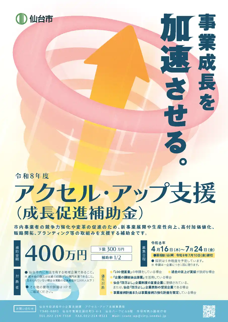 | 仙台市では、市内事業者の競争力強化や変革の促進のため、新事業展開や生産性向上、高付加価値化、販路開拓、ブランディング等の取組みを支援する「アクセル・アップ支援(成長促進補助金)」を実施しています。事業者の皆様のたくさんのご応募をお待ちしています。 | |||||||||||||||