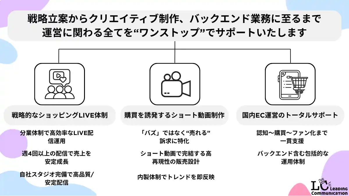 自社スタジオと機材を完備し、演者・ディレクター・管理側が連携した高頻度かつ高品質なLIVEコマース運用を日本国内で実現できる点。 |
