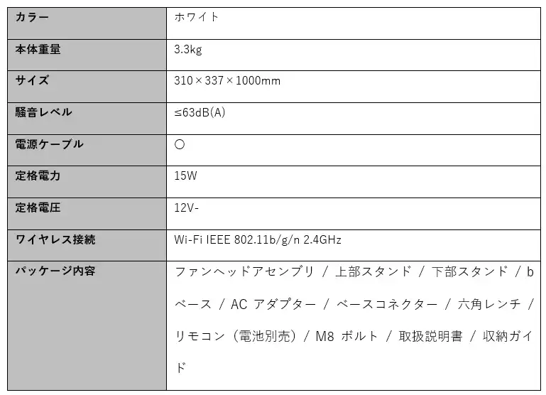 ■Mijia スマート扇風機 Pro Slimスペック概要 |