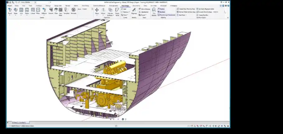 次に船殻分野では、機能を刷新した最新の船殻CADシステム「E3D Module」を導入します。船殻情報をフルデータベース化することで、上流設計から生産設計に至るデータ活用の可能性を最大化させます。 |