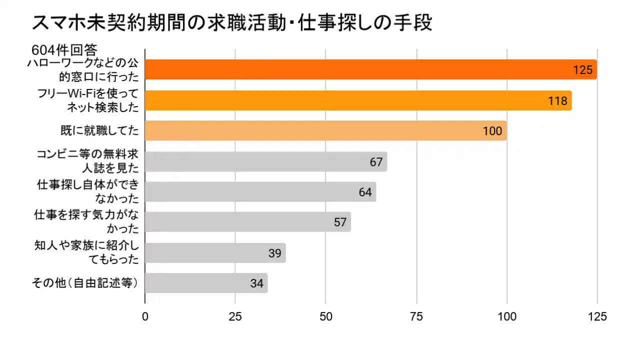 生活基盤を自力で立て直すための就労支援の場においても、同様の事象が発生しています。携帯電話が契約できない期間のお仕事探しについて、「ハローワークなどの公的窓口に行った」と回答した人は125人存在しました。 |