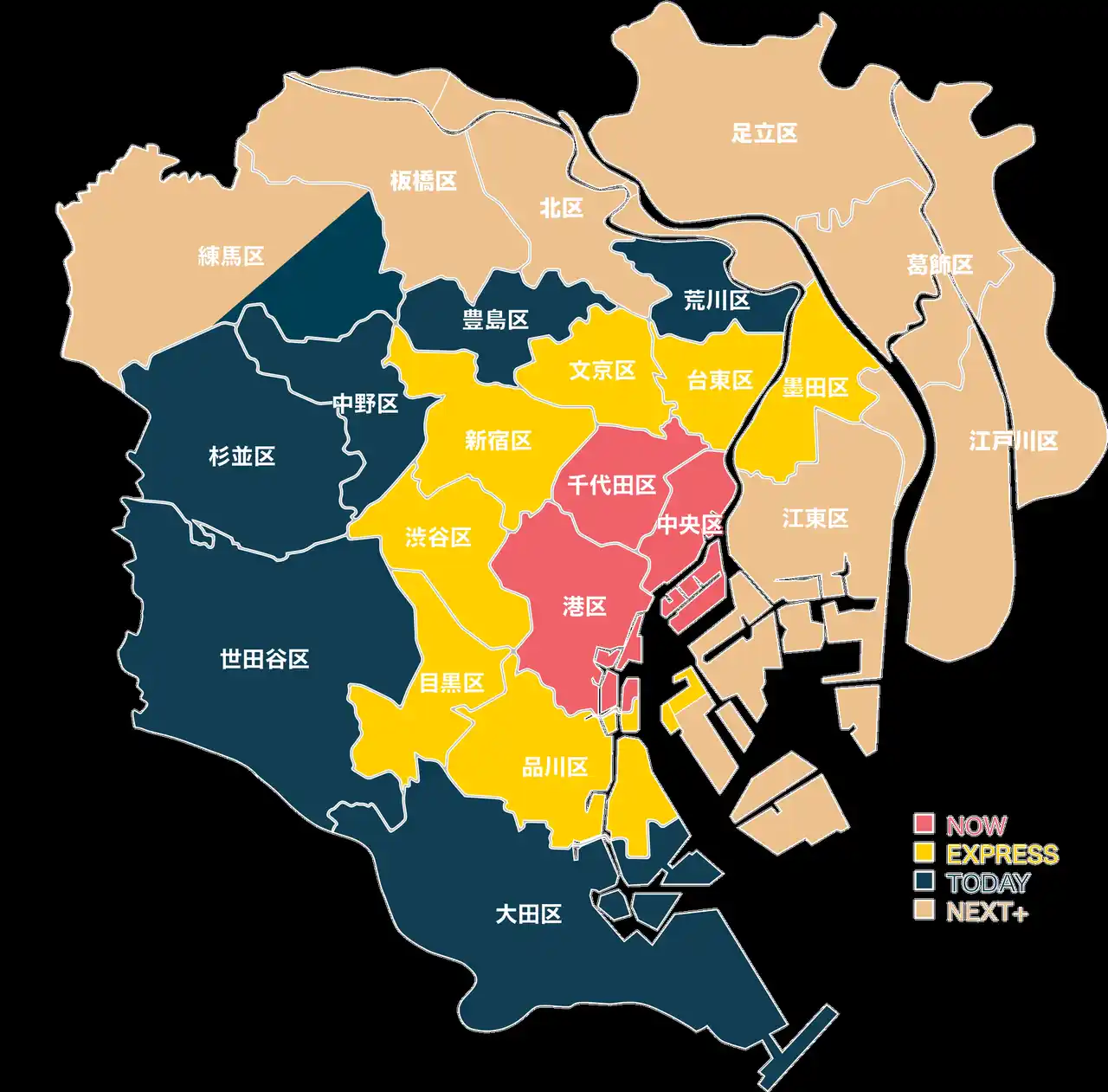 品川区、目黒区、渋谷区、新宿区、文京区、台東区、墨田区、江東区 |