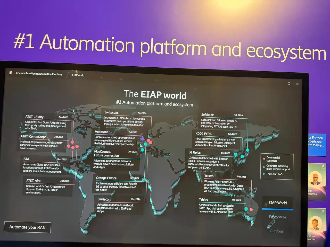 Ericssonブース内のモニターでは、Ericsson Intelligent Automation Platform(EIAP)の事例の一つとして、KDDIによるFYRA rAppのトライアルが取り上げられました。 |