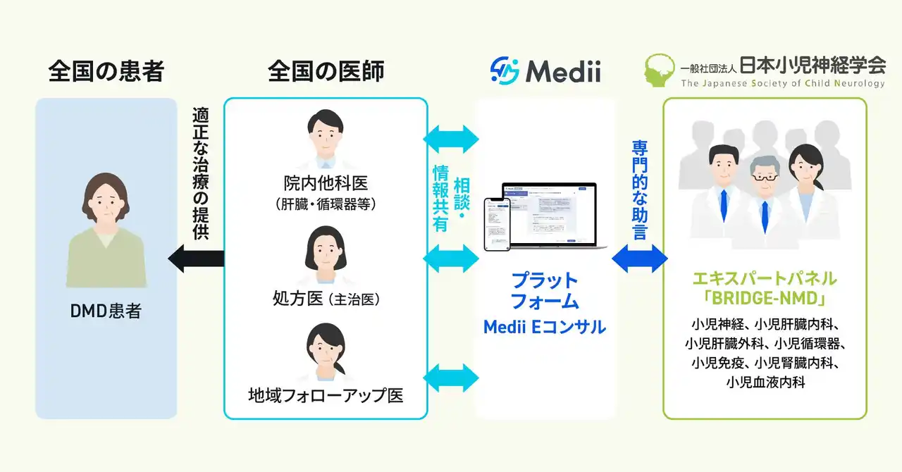本取り組みは、日本小児神経学会が公式に組成したエキスパートパネル「BRIDGE-NMD」※1への症例相談を、Mediiが運営する医師向け専門医相談サービス「Medii Eコンサル」を用いて実現したものです。本体制は、エレビジスの「適正使用ガイド」にも明記され、国内の高度医療における新たな安全管理の枠組みとなります。 |