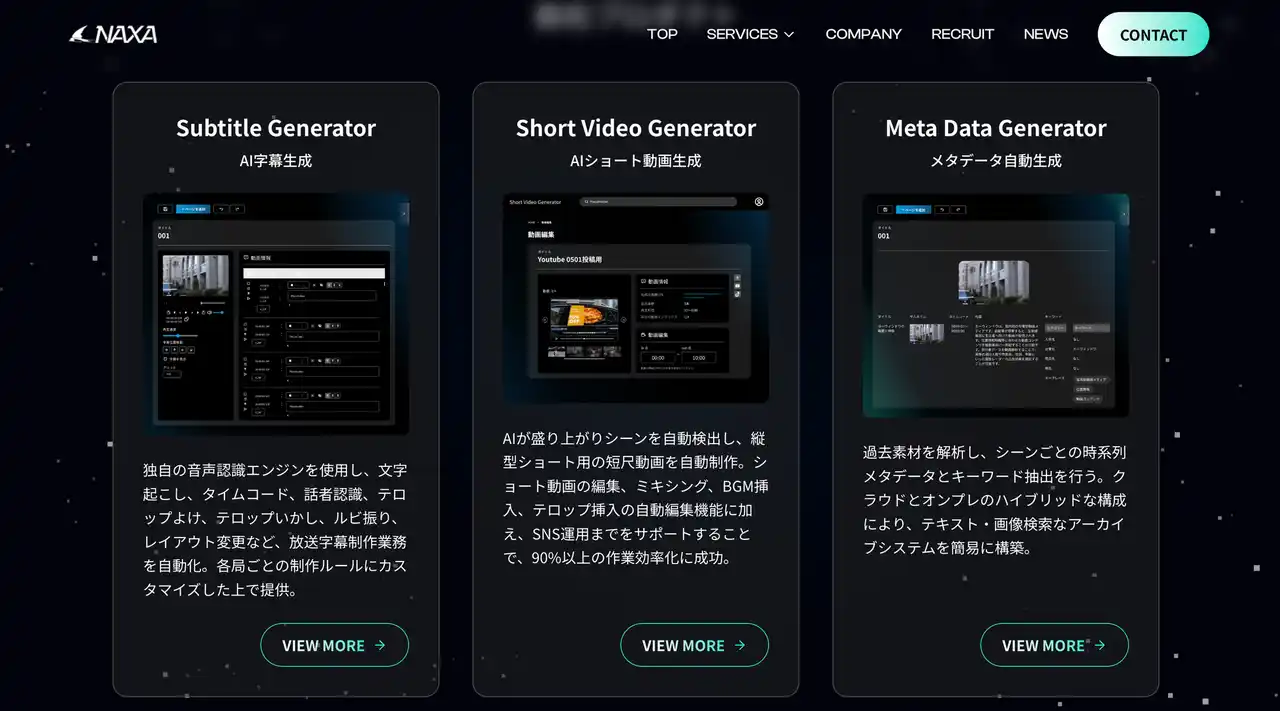 | NAXAは、テレビ・ 配信・ デジタルコンテンツ領域に特化したAI ・ DX企業であり、字幕生成AI、動画編集AI、配信アプリ開発などの技術を提供しています。これまでに大手放送局を中心に70件以上の開発プロジェクト実績を有し、配信アプリや動画編集アプリ、映像解析や日本語の音声認識モデルにおけるノウハウに長け、独自の技術資産を保有しています。 | |||